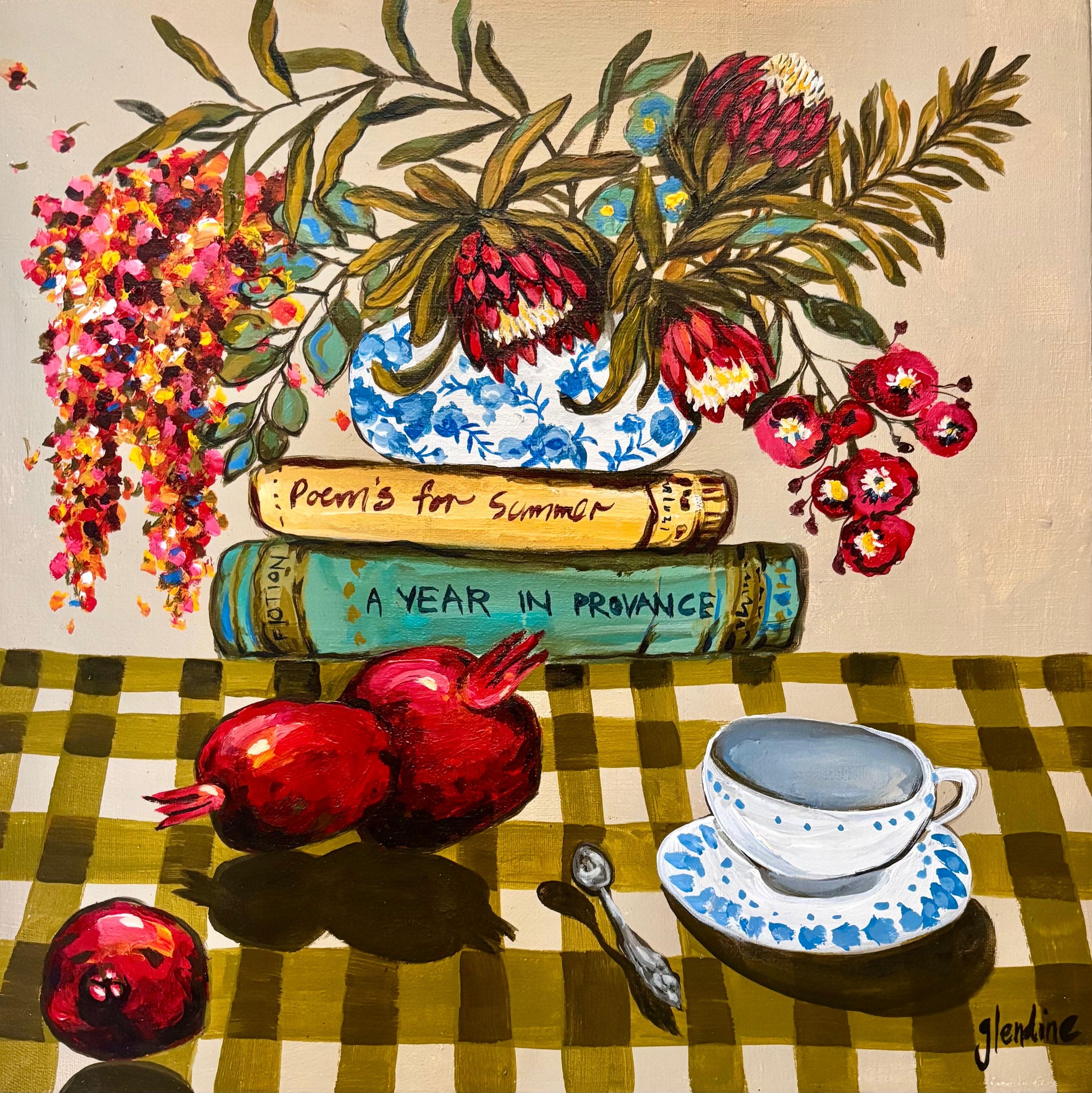 A Year in Provence carries the warmth of a slow summer holiday. With earthy greens, soft reds, and sun-washed tones blending in harmony. At its heart, a vase of proteas - South Africa’s beloved national flower, adds a touch of home to this gentle, joy-filled still life.