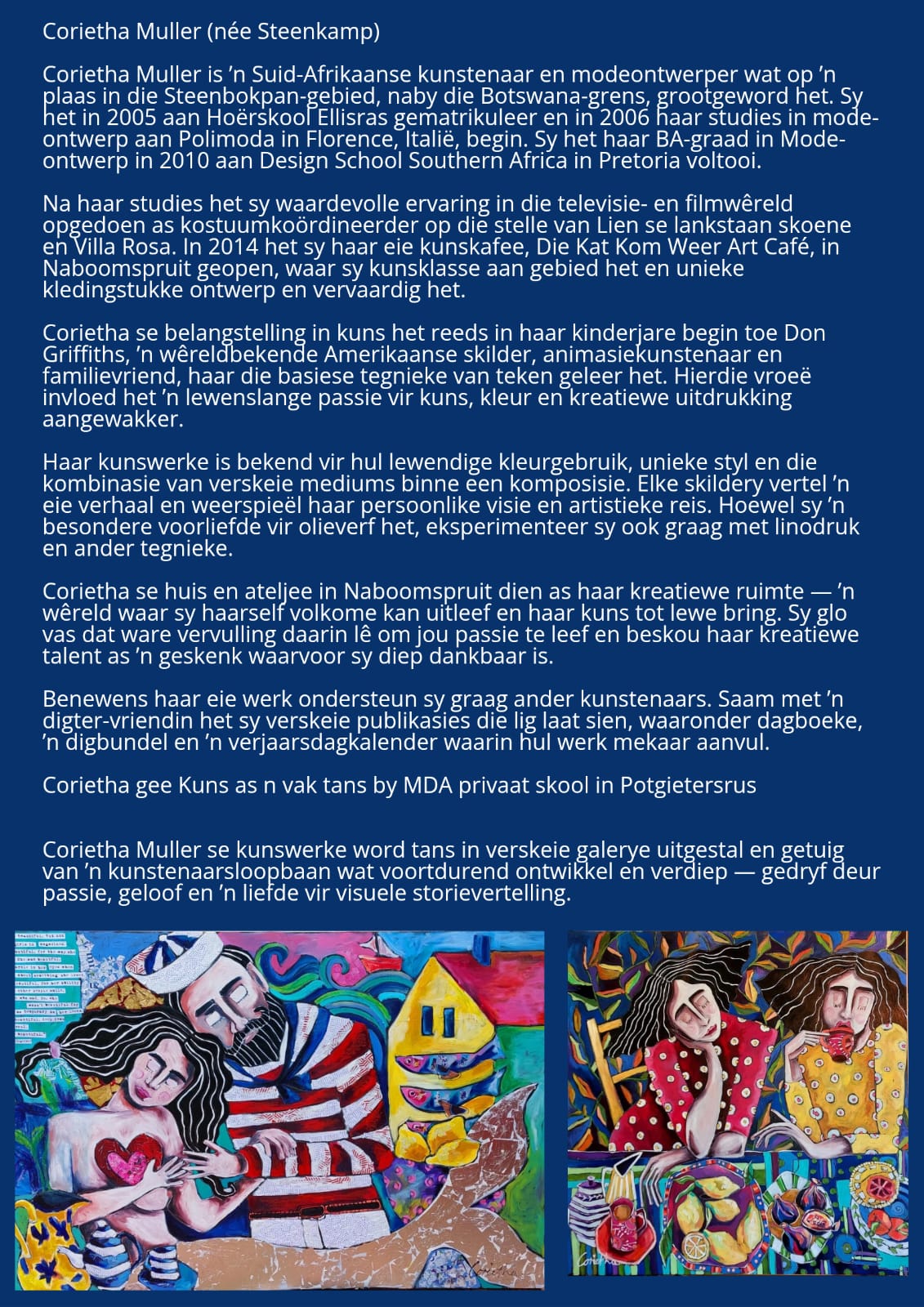 Corietha Muller is a South African artist and fashion designer whose love for creativity began in childhood with early guidance from American painter Don Griffiths. Her work is known for vibrant colours, unique style, and the blending of multiple mediums, from oil painting to linocut.