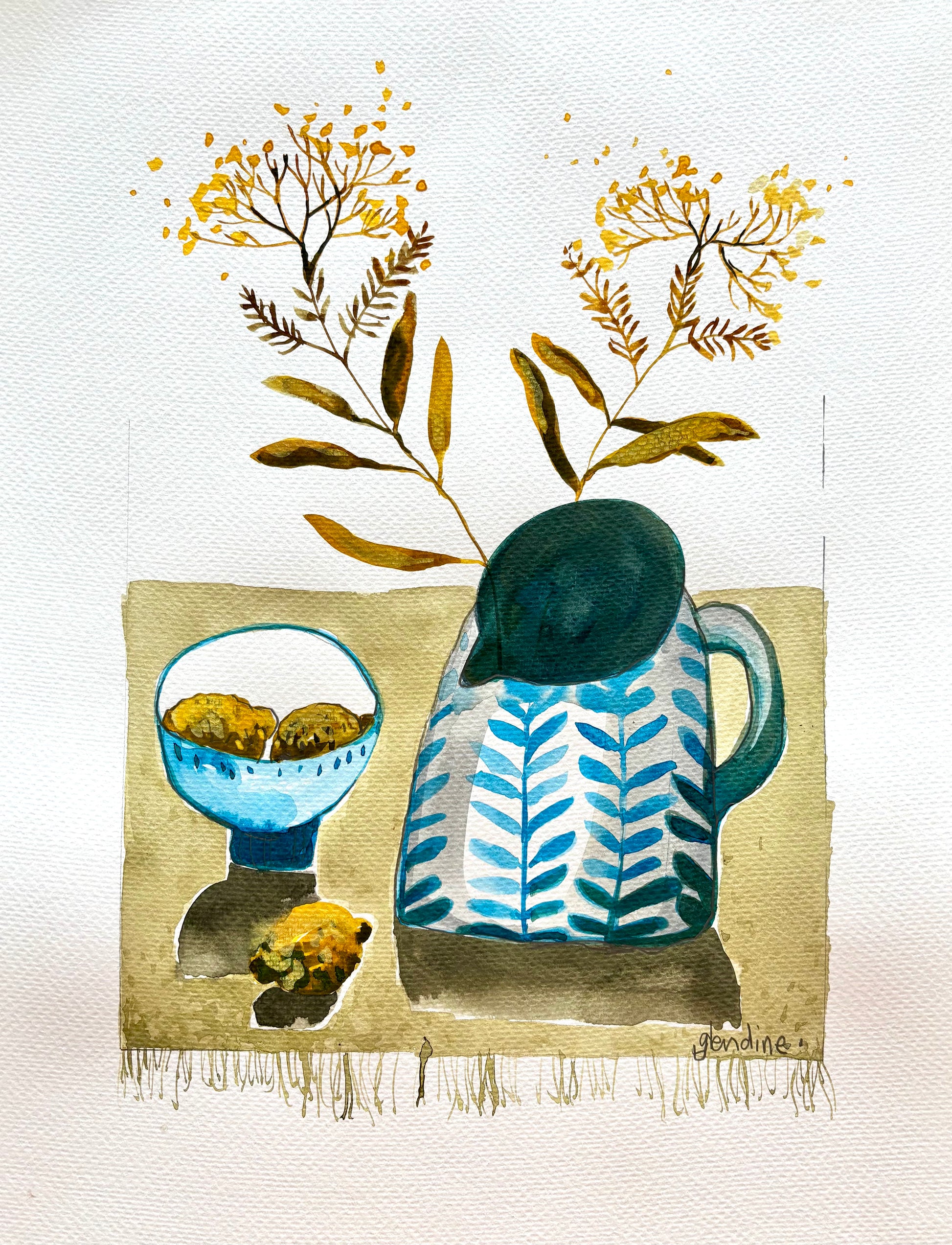 This series of original works on paper was created from the heart of my home, the kitchen table. It’s where life unfolds quietly: dogs at my feet, flowers in a jar, light shifting across familiar objects. These small, intimate pieces are rooted in observation and memory. They are a celebration of everyday beauty, daily life rituals, and the quiet stories that surround us when we slow down and take notice.