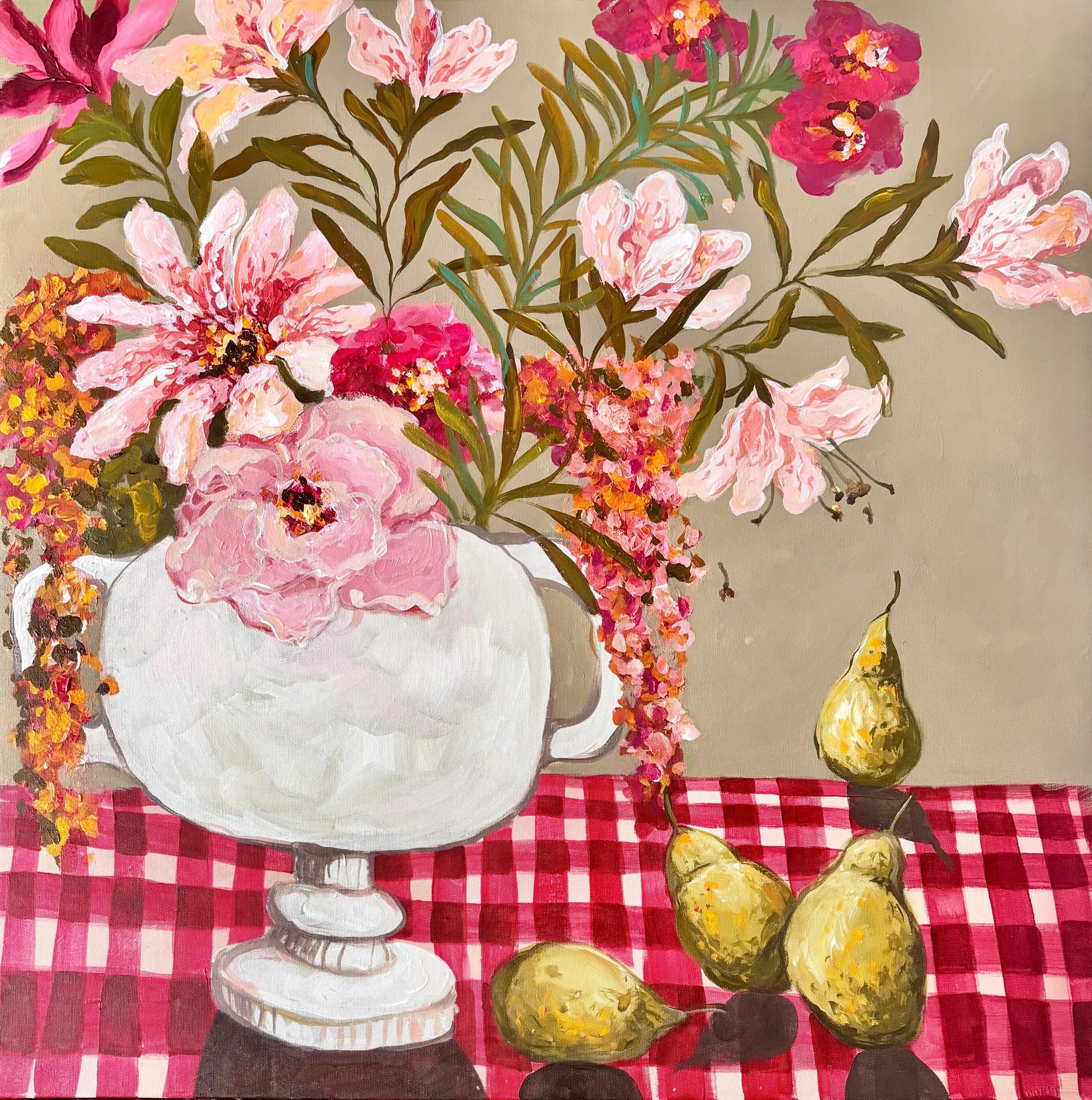 A tender and luminous still life, Madonna in Delft with Lilies brings together the calm of a quiet moment and the warmth of the season. Soft white lilies bloom from a Delft-inspired vase, set upon a checkered tablecloth that hints at celebration and the simple joy of gathering. It’s a painting that feels both peaceful and full of life, a timeless reflection of grace and beauty.